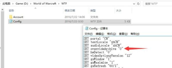 注:(右键点击Config.wtf,选择用TXT记事本打开,在里面加上SET overrideArchive "0")