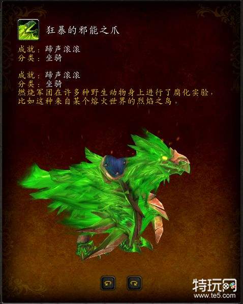 2.幽暗城天灾蝙蝠(部落)/泰达希尔角鹰兽(联盟),在荆棘战争第二周,前夕第三周(8月初)可获得,需要完成燃烧的泰达希尔故事线,两个坐骑分别是部落/联盟任务线最后一步的奖励,部落方围观烧树,联盟方撤离到暴风城。很可能在开放120后绝版。